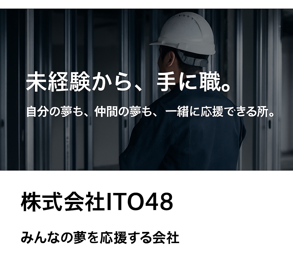 トップページ 2025.06.112025.06.12 手に職をつけて、 人生を変えよう。 都内中心の現場で安定した仕事量。 寮完備・祝い金3万円でスタートを応援します。 LINEで応募する 内装工事会社 ITO48 トップページ 会社紹介 会社概要 仕事内容 社長のあいさつ 募集要項 応募方法 採用までの流れ よくある質問 先輩の声 他社との違い ギャラリー